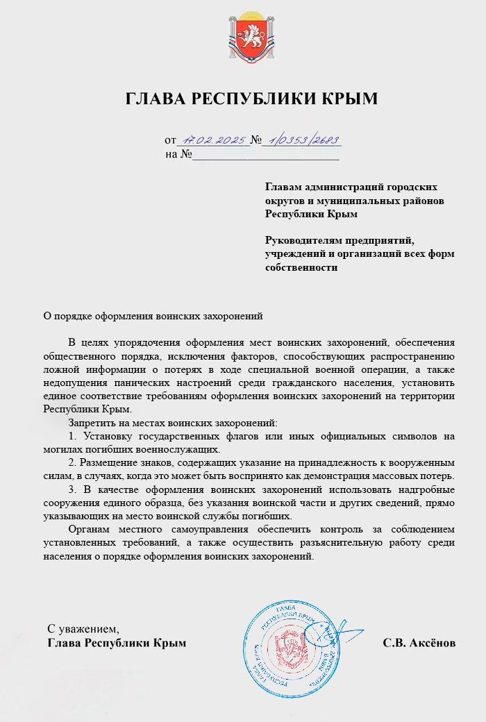 В числе прочего вводится запрет на установку государственных флагов или иных официальных символов на могилах погибших военнослужащих. Кроме того, для оформления воинских захоронений необходимо использовать надгробные сооружения единого образца, без указания воинской части и других сведений, прямо указывающих на место воинской службы погибших.Об этом говорится в документе, подписанном главой Республики Крым Сергеем Аксеновым.Данные меры принимаются в целях упорядочения мест воинских захоронений, обеспечения общественного порядка, недопущения паники среди населения, следует из документа.