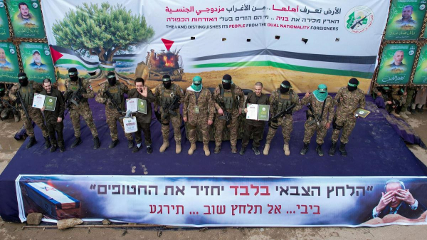 Накануне, 22 февраля, группировка ХАМАС перед передачей шестерых израильских заложников, вывела их на сцену в секторе Газа. Заложники позировали с выданными им «сертификатами». Через толпу пронесли гробы с останками погибших заложников.