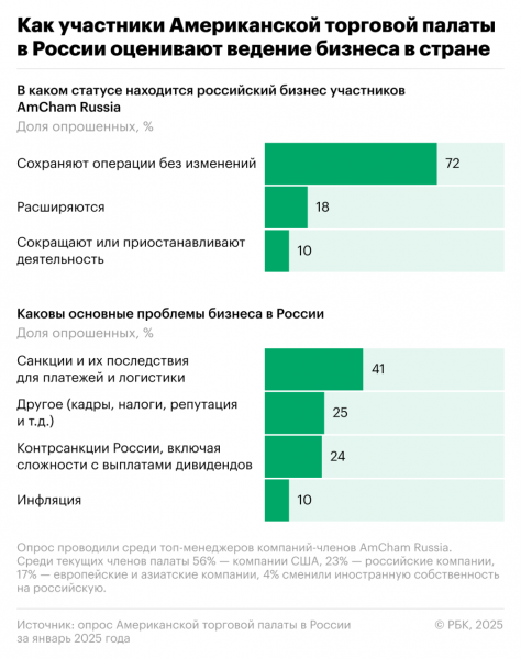 Ключевыми проблемами для иностранных бизнесменов в России стали санкции Запада, контрсанкции и инфляция. Это следует из опроса Американской торговой палаты в России (AmCham Russia) среди руководителей компаний — членов палаты, датированного январем 2025 года (опрос проводится регулярно).