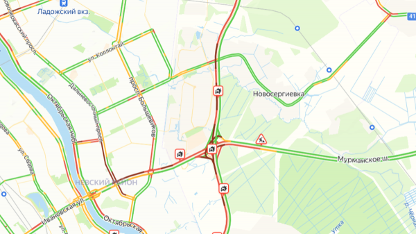 Сильные пробки также отмечаются на развязке возле торгового центра «Мега», где КАД пересекается с Мурманским шоссе. На трассе по направлению в город замечена пробка длиной почти 4 км.