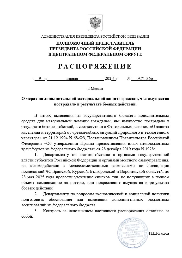 Полномочным представителем Президента Российской Федерации в Центральном федеральном округе инициирована программа по выделению дополнительных средств из федерального бюджета для компенсации утраченного, или поврежденного имущества в результате боевых действий, всем гражданам в Брянской, Белгородской, Курской и Воронежской областях, которые не получили возмещение, или жилищный сертификат.