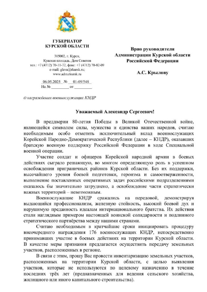 В сети распространилась информация, что врио губернатора Курской области А.Е. Хинштейн предложил наградить 176 военнослужащих КНДР за участие в боевых действиях в регионе в рамках СВО. Инициатива якобы приурочена к 80-летию Победы в Великой Отечественной войне и направлена на признание вклада Корейской народной армии.