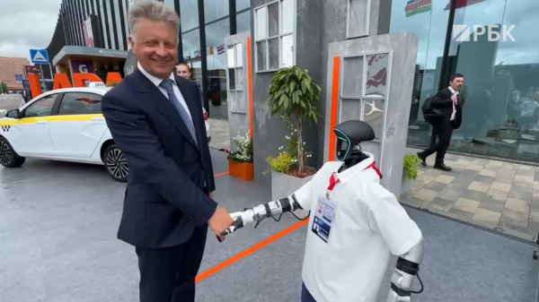 Глава АвтоВАЗа Максим Соколов на Петербургском экономическом форуме ответил на вопрос робота о будущем российского автопрома. Разговор произошел около одного из павильонов.