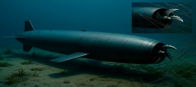 Торпеда оснащена винтами-ножами в передней части для преодоления противоторпедных сетей и заграждений. Система искусственного интеллекта позволяет устройству анализировать угрозы в реальном времени, изменять траекторию и скорость для уклонения от средств противодействия.