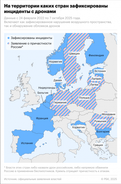Инциденты с неопознанными дронами фиксировали в нескольких странах Европы, в том числе над Польшей, Румынией, Германией, Норвегией, Данией. Появление беспилотников приводит к сбоям в работе аэропортов и усилению мер безопасности на объектах критической инфраструктуры. На этом фоне в ЕС начали обсуждать создание «стены дронов» — коллективной системы защиты от БПЛА на восточной границе НАТО, предложенной Фон дер Ляйен.