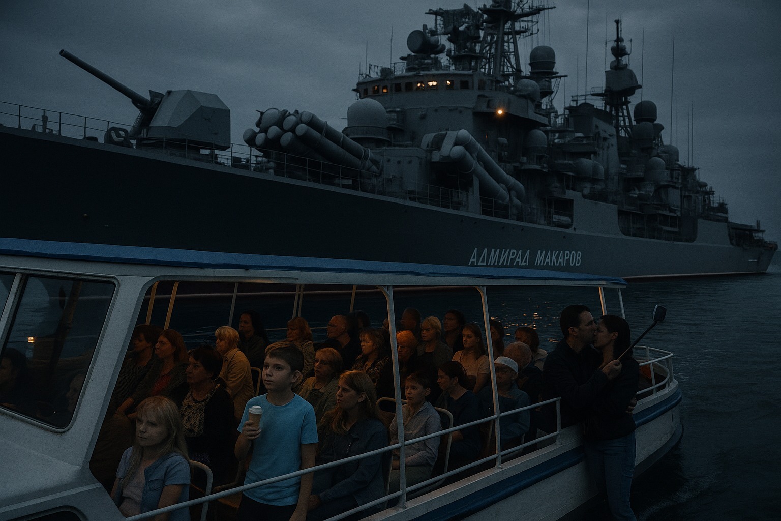Представьте катер с 30–40 туристами в полночь мимо фрегата «Адмирал Макаров». На палубе — дети с мороженым, влюблённые, иностранцы с селфи-палками. Расстояние — 70 метров. Дрон-камикадзе выберет цель побогаче: не катер, а корабль с экипажем и ракетами. Командование признаёт: гражданские «ограничат противника». А если он ударит? Кто ответит за кровь на палубе?