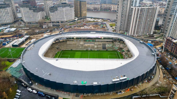 Строительная готовность объекта составляет 70%. Выполнены монолитные работы, монтаж металлоконструкций, устройство кровли, основного покрытия центрального игрового и большого тренировочного полей. Почти сделаны фасадные работы, ведутся отделка и благоустройство.