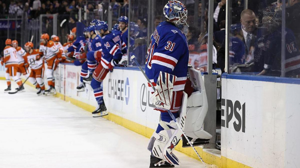 Российский вратарь «Нью-Йорк Рейнджерс» Игорь Шестеркин сломал свою клюшку после поражения в домашнем матче регулярного чемпионата НХЛ от «Анахайм Дакс».