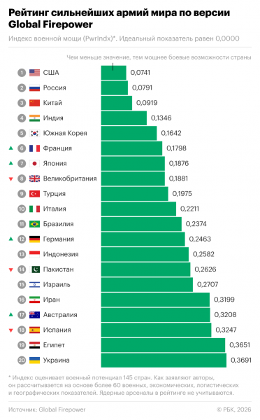 Рейтинг Global Firepower обновляется с 2016 года. Составители учитывают более 60 показателей, в том числе экономические, логистические и географические. Ядерные арсеналы в рейтинге не учитываются.